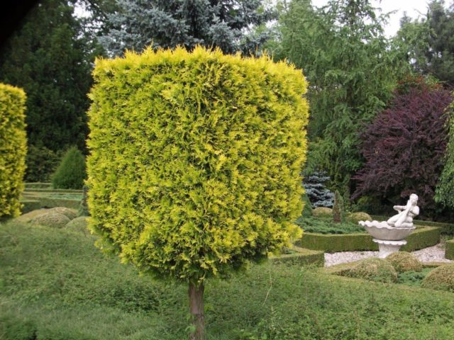 Tuyu Yellow Ribbon se poda en el cuarto año de la temporada de crecimiento, hasta que esta vez la plántula no necesita un corte de pelo.La forma natural de la corona es bastante decorativa, por lo que a menudo no se modifica. Si, de acuerdo con el concepto de diseño, se prevé la formación, la thuja tolera bien la intervención del jardinero, mantiene su forma durante mucho tiempo y se recupera rápidamente. La foto muestra una versión del corte de pelo Western Thuja Yellow Ribbon. Además de la formación de la corona, la poda sanitaria se realiza cada primavera, se eliminan los fragmentos congelados y secos.