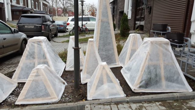 A finales de otoño, examinan los arbustos, cortan los tallos dañados, secos y viejos. Después de un riego abundante, el suelo se cubre con una capa de aproximadamente 10 cm. Los refugios para la tuya del oeste de Khozeri, como se muestra en la foto, están dispuestos si se esperan heladas severas en invierno. Las chozas hechas de ramas o postes, cubiertas con material no tejido, hacen frente bien al papel protector.