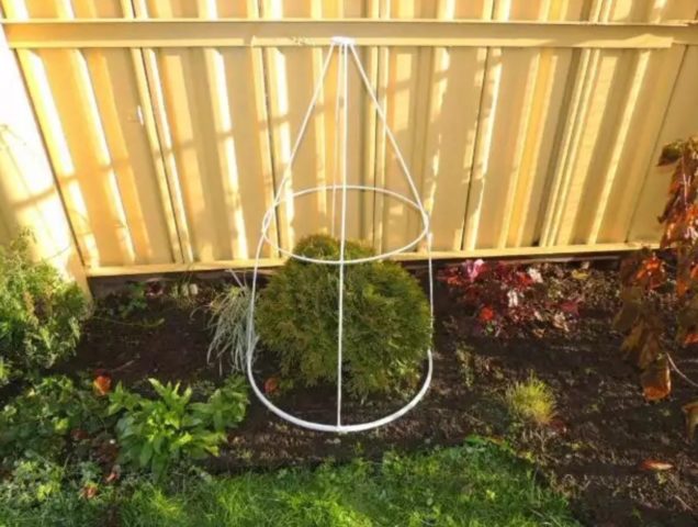 Si hay fuertes nevadas en la zona, vale la pena comprar un marco redondo o piramidal para el Teddy thuja occidental, según la foto y la descripción, que protegerá la corona para que no se deshaga en invierno. Las ramas de abeto o ramas se colocan en la parte superior de la estructura después de cortar los arbustos. En febrero y marzo, Thuja Teddy se cubre con una red o agrofibra para que las agujas no se desvanezcan con el sol.