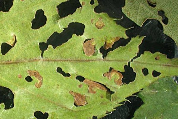 Rollo de hojas | Esta pequeña polilla está comiendo follaje. | Después de cosechar los frutos, el árbol se rocía con una solución de clorofos. | |