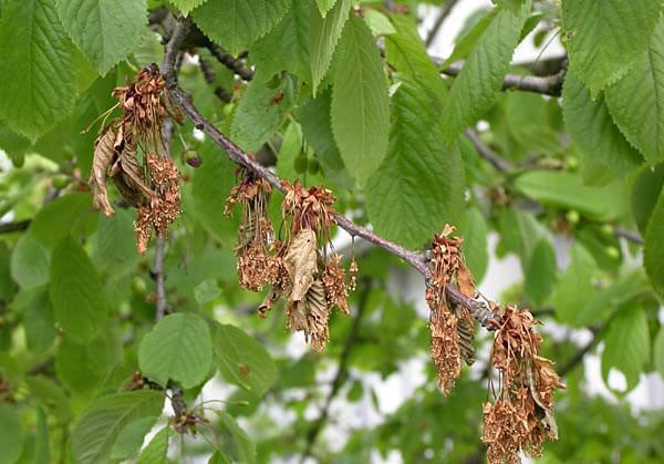 El primer signo de esta enfermedad es el ennegrecimiento de las hojas del cerezo alrededor de los bordes. Luego, las hojas de la cereza se marchitan y todas las ramas se secan. No existe una cura oficial para esta enfermedad, pero muchos entusiastas intentan rociar e inyectar en el tronco de un árbol antibióticos convencionales como la estreptomicina. La enfermedad puede retroceder si actúa de manera sistemática y regular. Como tratamiento adicional, se usa rociar el árbol con fungicidas, en particular, sulfato de cobre.