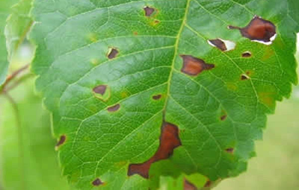 Entre las enfermedades de las hojas del cerezo dulce, la klyasternosporiosis es la más común. La enfermedad se puede diagnosticar por la aparición de manchas rojizas con un borde oscuro en las hojas. Después de un par de semanas, se forman agujeros en su lugar, de ahí el nombre de la enfermedad. Después de un tiempo, las hojas se secan por completo y se caen. Los frutos se pueden secar directamente sobre las ramas.