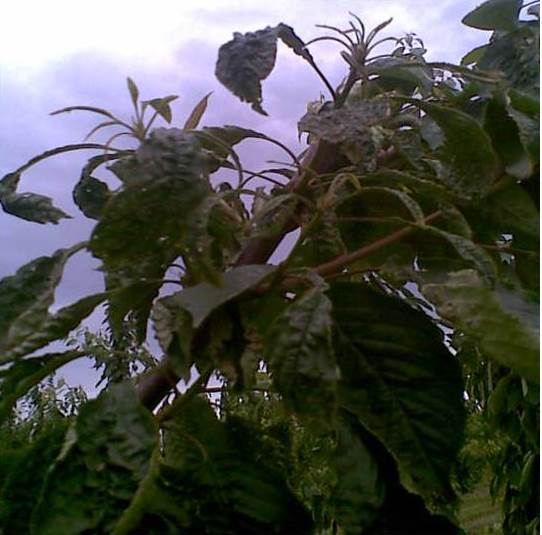 Otra enfermedad fúngica de la cereza dulce, en la que las hojas se arrugan y rizan con una hinchazón notable. Y en su parte inferior, se reconoce bien una capa pegajosa blanca.