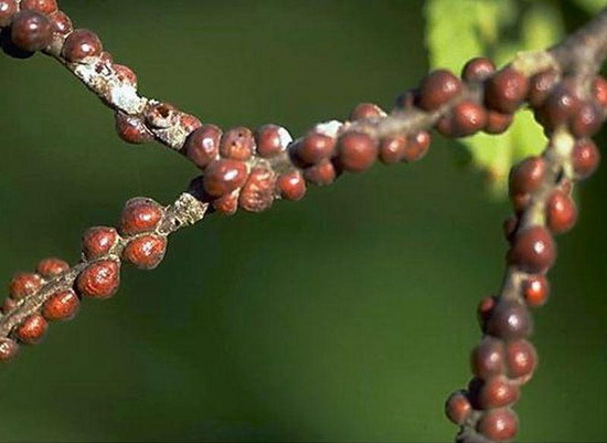 La plaga tiene un tamaño muy pequeño (1-2 mm) y una coloración protectora, por lo que es difícil notarla. Pero si miras de cerca, puedes ver crecimientos sutiles en la corteza de las ramas. La vaina succiona la savia de las plantas, por lo que las hojas y las ramas pueden secarse y caerse si están gravemente dañadas.
