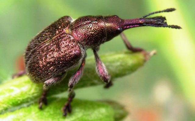 La plaga es un escarabajo de bronce de hasta 1 cm de largo, los escarabajos y sus larvas pasan el invierno en el suelo. Se arrastran hasta la superficie durante el período de floración de las cerezas y se alimentan primero de los capullos y las flores, y luego de los ovarios y los frutos. Las plagas son bastante capaces de roer agujeros de diferentes tamaños en las hojas. Por lo tanto, si las hojas de la cereza están en los agujeros, lo más probable es que el gorgojo haya trabajado aquí. Las larvas se depositan en frutos.