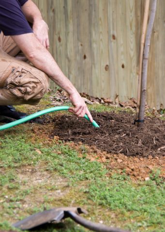 - Atado a un soporte, compactando la tierra, regado.