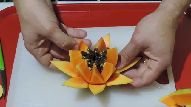 La piel madura es fina y tierna. Puede pelar la papaya fácilmente antes de comerla con un cuchillo afilado o un pelador de papas. Pero por conveniencia, la fruta se corta primero a lo largo y por la mitad. Se quitan las semillas y solo entonces se quita la piel. De lo contrario, puede perder un poco de jugo o triturar la pulpa tierna.