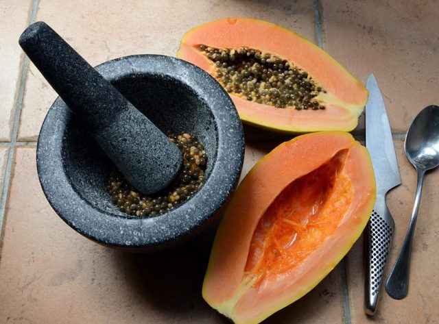 Los granos se pueden comer enteros, masticados o molidos en polvo. Para los humanos, este sustituto de la pimienta no es tóxico, pero requiere una adicción gradual. Para probar la tolerancia del producto, basta con masticar y tragar un grano de papaya. En ausencia de reacciones inesperadas, la ingesta puede continuar, pero durante la primera semana, no debe comer más de 2 semillas por día.