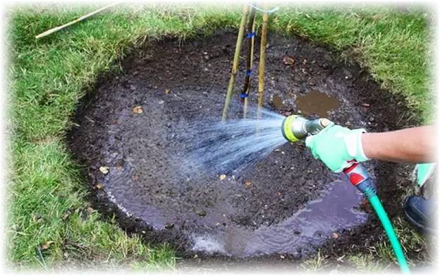 - a principios de otoño, drene el exceso de agua de los círculos cercanos al tronco, después de la caída de las hojas, realice un riego con carga de agua a una tasa de aproximadamente 40 cubos por árbol adulto. Para las variedades otoño-invierno, esta operación se lleva a cabo en la formación final de los frutos. Todo el círculo del tronco debe humedecerse hasta una profundidad de aproximadamente 1,5 m.