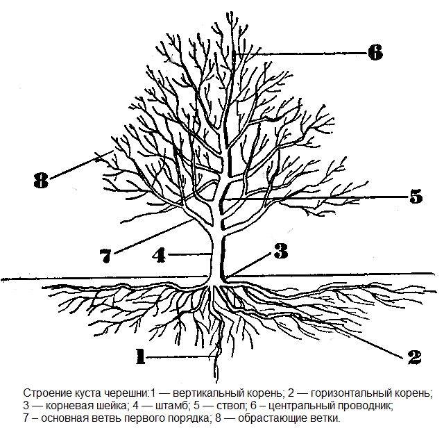 Una característica del cuidado de las cerezas, como de cualquier árbol, es la formación de la copa. Una plántula joven, cuando se planta en primavera, verano u otoño, se poda para equilibrar las partes aéreas y subterráneas. Se dejan 3-4 ramas fuertes en el árbol, acortándolas en 1/3 de su longitud. El tronco central se corta de modo que su punta quede 25 cm por encima de las ramas esqueléticas.