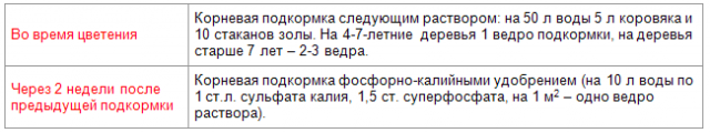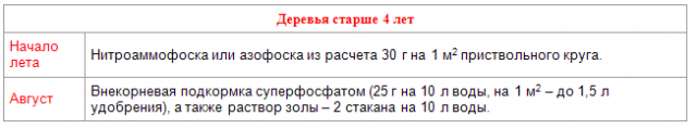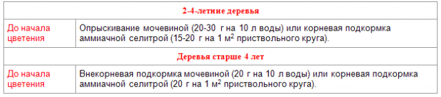 Antes de la floración, el aderezo se realiza con urea o nitrato de amonio. El cuidado de árboles de diferentes edades proporciona diferentes tasas de fertilización, lo que se refleja en la tabla.