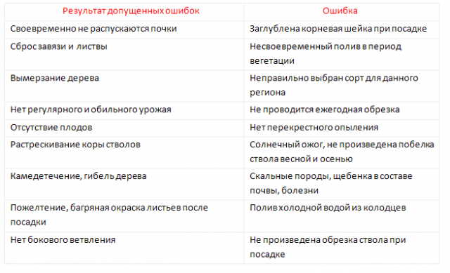 Los errores en el cuidado de las cerezas resultarán, en el mejor de los casos, en la pérdida de la cosecha. En el peor de los casos, el crecimiento de la copa se ralentizará, el follaje, el ovario y el color comenzarán a caer y el árbol morirá. En la tabla se muestra una lista de errores comunes al cuidar un cultivo.