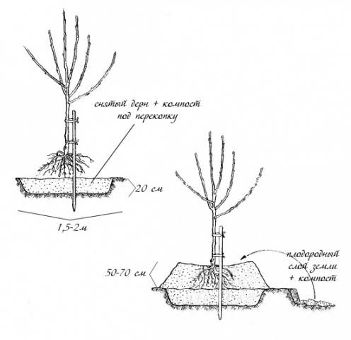 - La distancia entre árboles altos se elige al menos 5 m.Entre manzanos medianos - 4 my 3 m entre enanos.