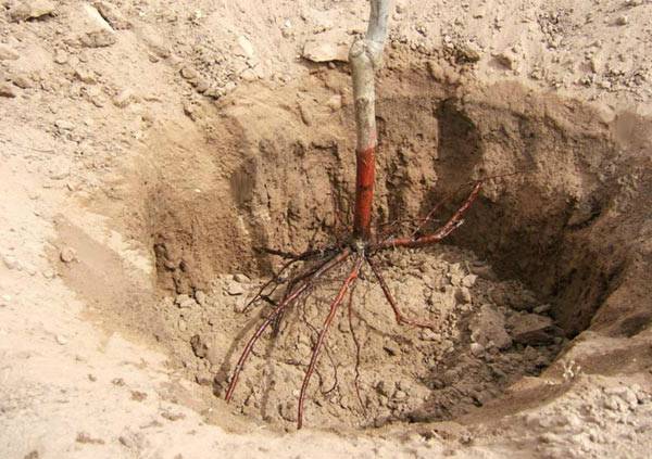 En el centro del hoyo cavado, se forma un montículo, se coloca una plántula sobre él, enderezando bien las raíces, tratando de profundizarlas en el suelo. La plántula se cubre con tierra preparada, se derrama con agua y se vierte en un balde. Duerme con la tierra de nuevo.