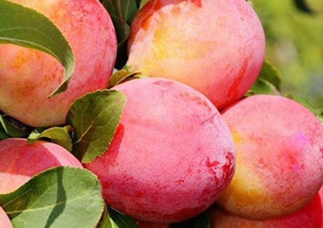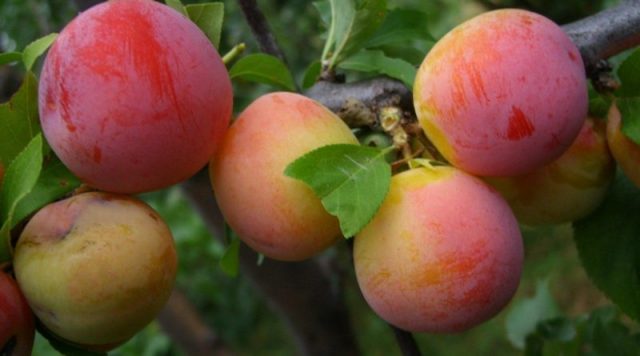Es muy fácil reconocer los frutos de la ciruela amarilla de Altai. Son de forma casi redonda, con un surco pronunciado, y en color son amarillos, con un tinte anaranjado y un característico "rubor" escarlata pálido. La capa de cera es claramente visible en la piel. Una fruta pesa en promedio unos 15 g.