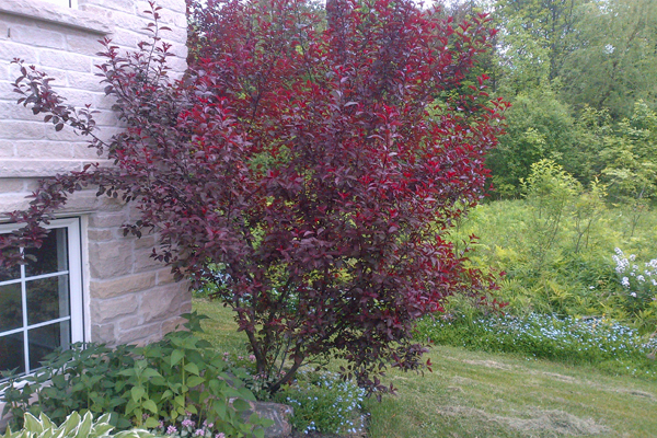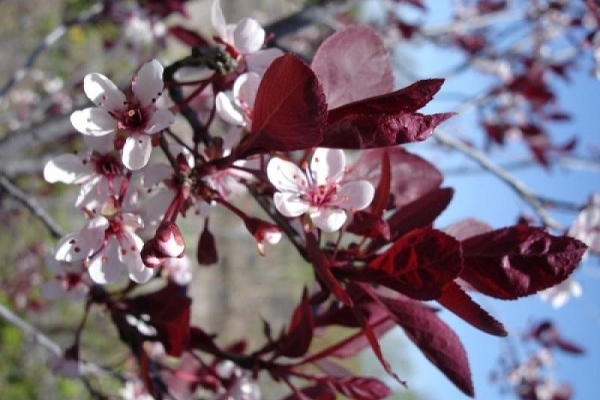 Para decorar el jardín, una ciruela decorativa de hojas moradas es ideal, un arbusto que alcanza 1,5 de altura, con hojas lanceoladas alargadas. Al principio, el follaje del arbusto de ciruela tiene un color rojo oscuro, luego, a medida que crece, puede cambiar a un tono marrón oscuro. La ciruela decorativa de hojas moradas produce flores blancas o rosa claro simultáneamente con la aparición del follaje, y a finales de septiembre da una cosecha de frutos rojo oscuro.