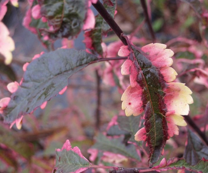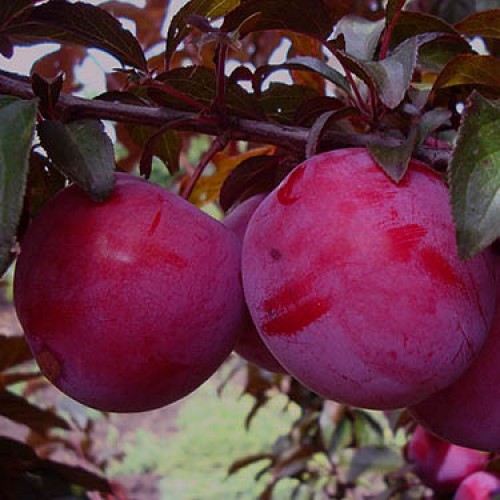 Una variedad arbustiva de ciruela de hojas rojas llamada Hesei, que produce follaje del color verde habitual al principio, pero luego las hojas se vuelven moradas, con un borde rosado o crema alrededor de los bordes. La variedad florece con flores blancas a finales de abril, antes de que florezca el follaje o simultáneamente con él. Produce pequeños frutos rojos agridulces.
