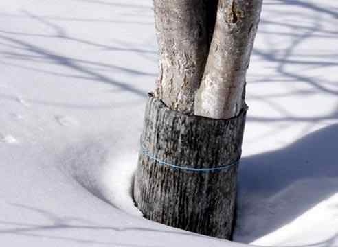 - En vísperas de las heladas, el tronco del árbol está bien envuelto con ramas de abetos o arbustos. Desde arriba, el aislamiento del jardín se envuelve en celofán, material para techos o tela. Esto protegerá al árbol de las heladas y los roedores.