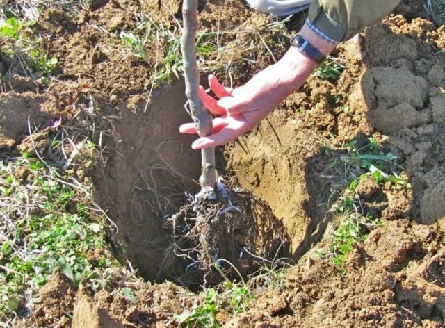 Los pozos para los árboles se preparan en el otoño, de modo que para la primavera el suelo se haya asentado bien y esté saturado de fertilizantes. Antes de plantar, se drena el fondo. Puede utilizar material improvisado, como ladrillos rotos, escombros o baldosas.Las plántulas se colocan en el centro del agujero, se cubren con tierra, pero el collar de la raíz se deja en la superficie del suelo 5 cm.