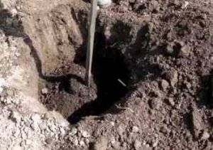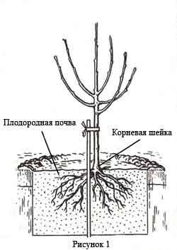 Al plantar en primavera, los fertilizantes se aplican a la última porción del suelo, que se rocía sobre la plántula. Se coloca una clavija en el hoyo de plantación para atar el árbol joven plantado.