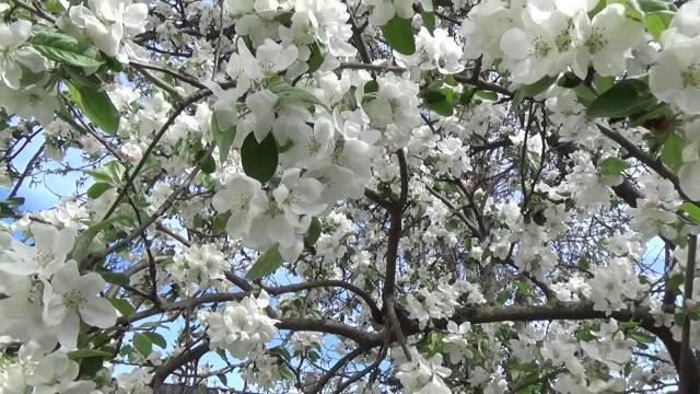 Flores de manzana Relleno blanco en términos medios. Las flores son blancas, bastante grandes, en forma de platillo, a veces los pétalos tienen un ligero tinte rosado.