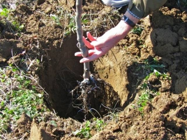 - Se cava el hoyo y se pisotea la tierra con fuerza. En este caso, es necesario asegurarse de que el cuello de la raíz del tronco del árbol esté aproximadamente a 6-7 cm por encima del nivel del suelo.