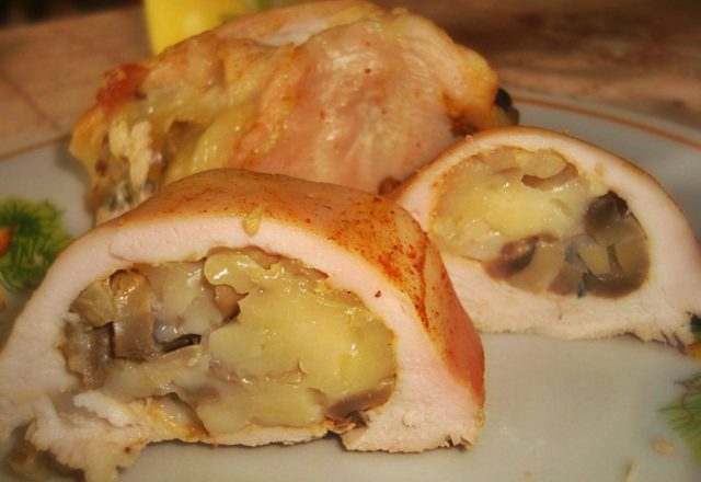 - Poner el relleno sobre el filete, espolvorear con queso, envolver en un rollo, asegurar con hilo o brochetas.