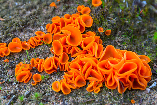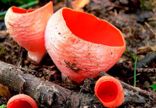 Un platillo rojo rosado crece en una familia numerosa. Los cuerpos fructíferos se plantan tan cerca unos de otros que posteriormente crecen juntos en una gran masa ondulada de color naranja.