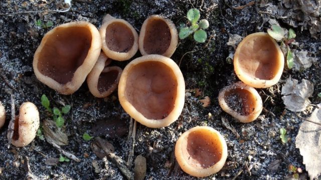 Discina tiroidea - un hongo comestible, una de las variedades de petsia. El color del gemelo es más oscuro, marrón o beige. La tapa es desigual, su superficie es rugosa.