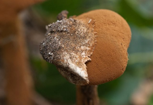 La pulpa del sombrero en el corte tiene fibras transparentes y una gran cantidad de masa de esporas. Debido al movimiento de las fibras (capilares) bajo la influencia del viento y los cambios en la humedad del aire, las esporas se dispersan. En una battarreya madura, la pulpa de ternera se vuelve polvorienta y permanece en este estado durante mucho tiempo.