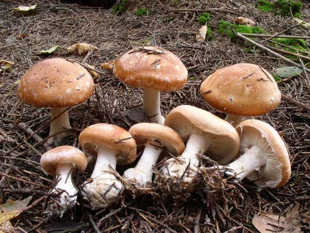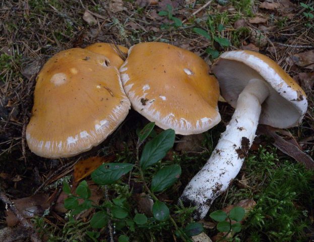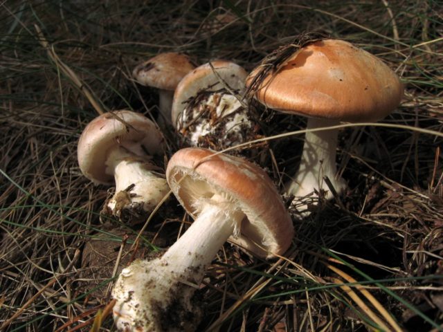 Amanita muscaria (Amanita muscaria) - no comestible y alucinógeno. Puede distinguir un doble por una pierna delgada, placas cremosas, un anillo de telaraña con bordes afilados. Durante el período de sequía, estos signos no son tan pronunciados, por lo tanto, vale la pena recoger frutas solo en clima lluvioso y junto con un recolector de hongos experimentado.