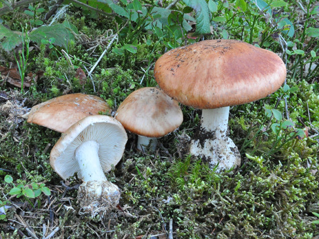 Webcap ocre claro (Cortinarius claricolor) - gemelo no comestible y venenoso, no tiene un engrosamiento tuberoso característico, el color de la tapa es más cálido con un tinte rojizo.