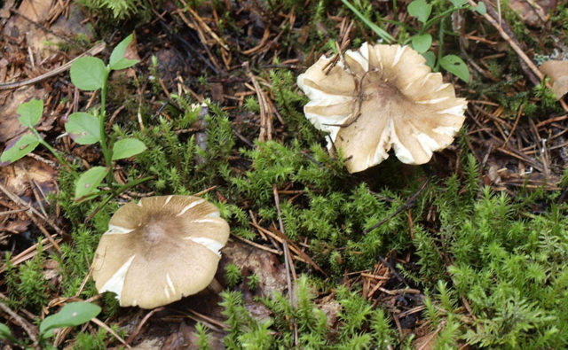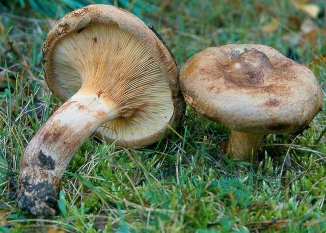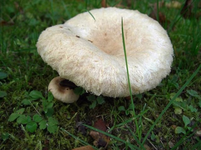 Entre las fotos y descripciones de hongos que parecen hongos de leche, hay un algodoncillo falso seco, tiene un gran casquete cóncavo ancho y un color crema blanquecino con círculos marrones. Su carne también es cremosa y densa, tiene un sabor picante. En tiempo seco, a menudo se agrieta en la tapa, de ahí su nombre.