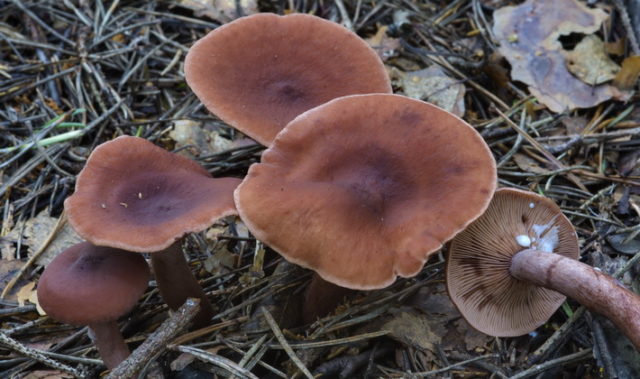 Camphor lactarius, que es un gemelo falso, crece en suelos húmedos, principalmente en bosques de coníferas. Su gorra es pequeña, de hasta 6 cm, de forma estándar en forma de embudo con bordes ondulados. La textura de la tapa es brillante, el color es marrón rojizo, la pulpa es de color marrón ladrillo con un olor desagradable a alcanfor.