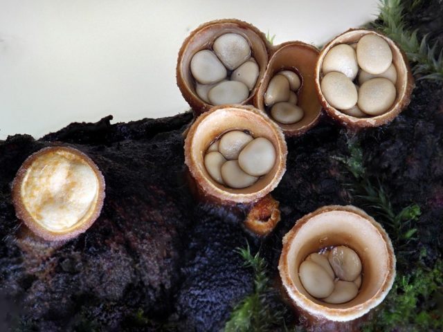 El conocimiento de la especie debe comenzar con las características externas. El cuerpo del fruto en los ejemplares juveniles es oblongo, de color café claro. La superficie está cubierta con una película blanca como la nieve que cubre la capa de esporas. A medida que madura, la membrana se rompe y aparecen peridioles oblongos de color gris grisáceo, que desempeñan el papel de contenedores de esporas. Se fijan al fondo de los vasos mediante un cordón micelial.
