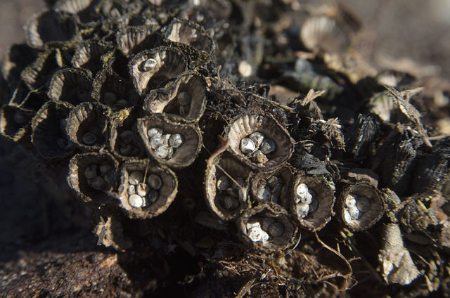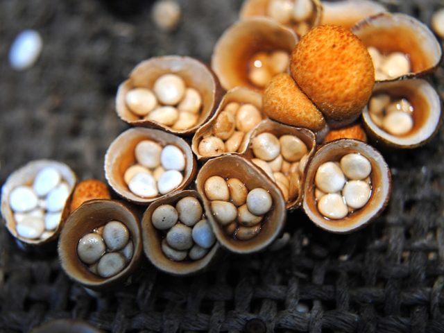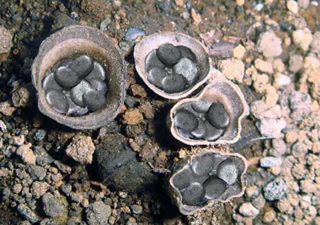 Los peridioles de ángulos redondeados tienen un color transversal, pero a medida que se secan se vuelven blancos como la nieve. El peridio está unido al interior con hilos de micelio.