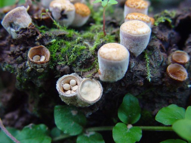 El vaso de Oll es un representante inusual y no comestible del reino de los hongos. Se puede encontrar en sustratos podridos y raíces de madera muerta. Durante la apertura de la capa superior, aparecen peridioles, que se asemejan a la forma del castaño o de los granos de café.