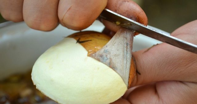 La película marrón que cubre la tapa del engrasador debe quitarse cada vez que use los champiñones, de lo contrario le dará al plato terminado un color oscuro y un sabor amargo. Debes quitarlo antes de remojar el hongo en agua. Un engrasador húmedo es muy resbaladizo y será muy difícil de sostener en sus manos. Para los aceites de limpieza, es mejor ponerse guantes de goma en las manos, ya que la película que se quita de la superficie de la gorra contiene un pigmento colorante. La protección para las manos se volverá marrón oscuro si no se usa. Esta pintura es bastante persistente y no se lava durante varios días.