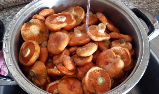 Después de eso, los champiñones pelados deben procesarse de una manera especial para eliminar el sabor específico.Para ello, se sumergen en agua fría durante 3 días, cambiándola cada 4-5 horas. Además, este proceso hace que la pulpa quebradiza sea más densa.