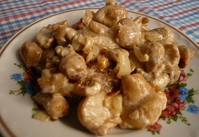Los impermeables en forma de pera guisados en crema agria junto con papas hervidas y cebollas resultarán muy sabrosos, satisfactorios y fragantes.
