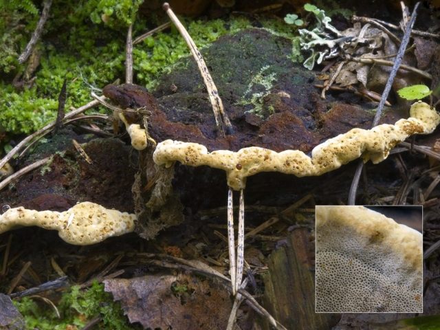 - La gorra puede estar doblada en posición postrada, redondeada en forma de cojín o estrecha y alargada. Sigue las curvas de la superficie de la madera sobre la que crece. El grosor promedio del cuerpo fructífero es de 10-15 cm, el ancho es de hasta 3 cm. Una característica distintiva de la especie es la presencia de una cresta ondulada ligera contrastante a lo largo del borde con una estructura porosa.
