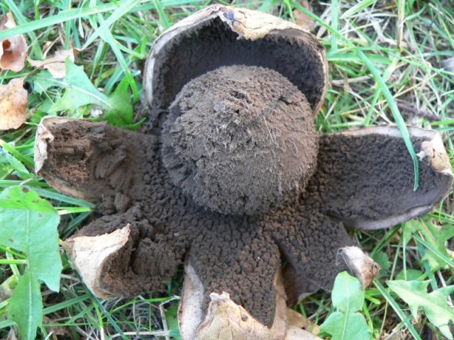 Con la edad, la capa exterior se rompe en 3-7 partes en forma de lóbulos. El diámetro de la cáscara desplegada del cuerpo fructífero puede alcanzar los 12 cm Externamente, el triple geastrum se vuelve como una estrella. El color del hongo puede ser muy diverso, desde marrón claro hasta blanco o gris oscuro.