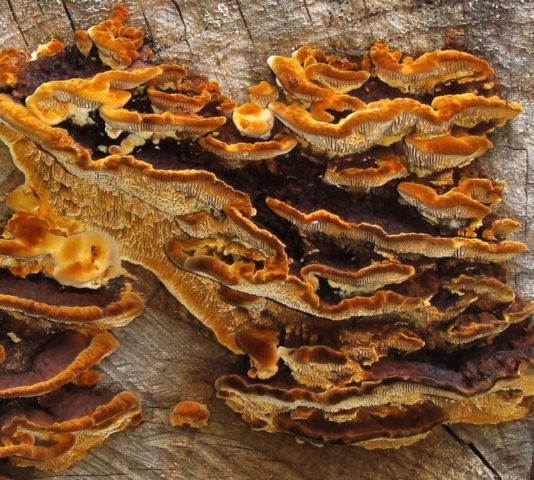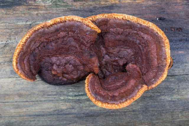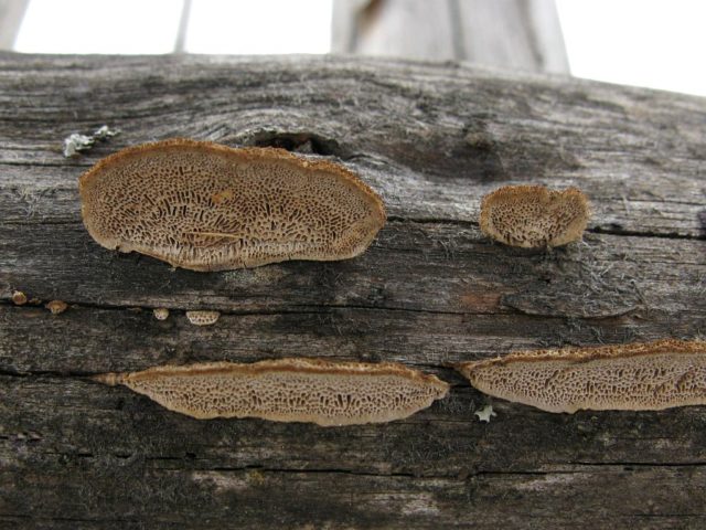 Los dobles incluyen log gleophyllum, un hongo cosmopolita que crece en árboles de hoja caduca, más a menudo en madera procesada de edificios. La especie es de un año, pero el ciclo biológico puede durar hasta dos años. Se ubica individualmente o en pequeños grupos con partes laterales fusionadas. La capa portadora de esporas es mixta: tubular y laminar. El color es gris oscuro, la superficie es grumosa, rugosa, la pulpa es delgada. Los hongos no son comestibles.