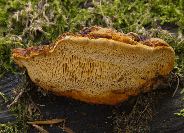 - Himenóforo en una especie de tipo mixto. Al comienzo del crecimiento, está formado por pequeños tubos dispuestos en un laberinto. Con la edad, la capa portadora de esporas se vuelve laminar. Platos de varias formas y tamaños irregulares, disposición densa.