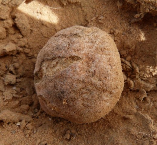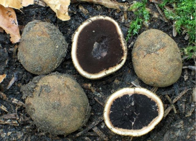 El cuerpo frutal de esta especie se encuentra debajo de la capa de la tierra. El hongo está cubierto de irregularidades con varios bordes. Su superficie brilla en varios tonos: desde el burdeos hasta el negro. Cuando se presiona, se oxida. El hongo tiene una forma redonda o irregular, el tamaño es de 3-9 cm.