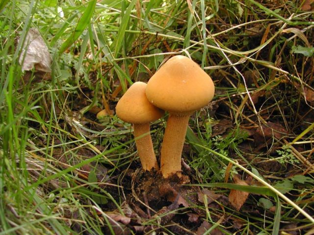 El joven representante de esta especie tiene un gorro hemisférico que varía en tamaño de 5 a 25 cm, amarillo dorado mate, amarillo ocre, a veces naranja. A medida que el hongo crece, aparece un bulto (montículo) en el centro de la tapa y se asemeja a una campana en apariencia. La superficie parece granulada. En un hongo maduro, este signo disminuye y puede desaparecer por completo. Placas delgadas, curvas y frecuentes se encuentran dentro del paraguas del sombrero. Crecen hasta el cuerpo fructífero. Mientras el hongo es joven, los platos se cubren con una manta densa. En el borde, en el lugar de su fijación, a veces aparece una franja oscura. El color de la colcha no difiere del color del gorro, aunque en algunos casos puede tener un tono más oscuro o más claro. A medida que crecen, las placas cambian de color de amarillo pálido, blanquecino a marrón, incluso oxidado. Las esporas tienen una forma alargada y puntiaguda. El color del polvo de esporas es marrón oxidado. Después de la maduración de las esporas, las placas se oscurecen.