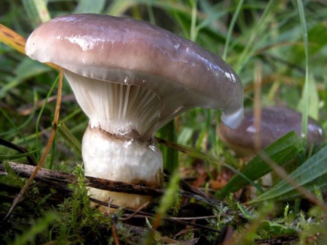 También tiene otros nombres: musgo pegajoso, babosa. La forma del hongo es hemisférica, la pulpa es carnosa. El sombrero está abierto, con un borde doblado y un centro hundido. Puede ser gris, azul grisáceo o marrón grisáceo con bordes violáceos y un centro claro. El diámetro del tapón es de 4 a 10 cm, su superficie es viscosa, con un brillo característico. En el pelaje viejo y húmedo, se pueden ver manchas oscuras en la gorra.