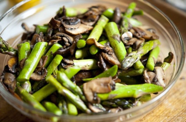 - Revuelva los espárragos y los hongos ostra real, esparcidos en una hoja.