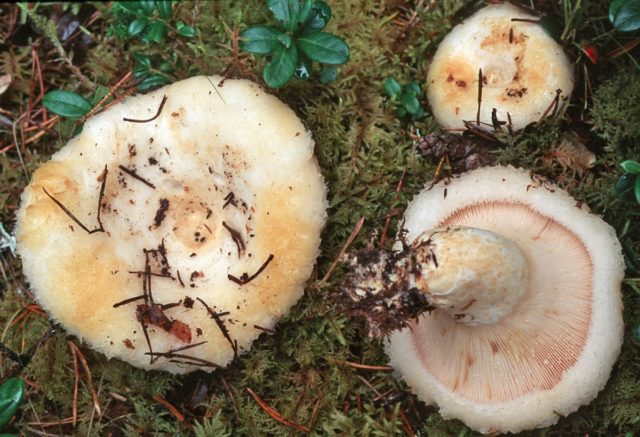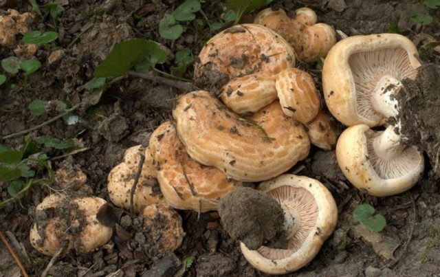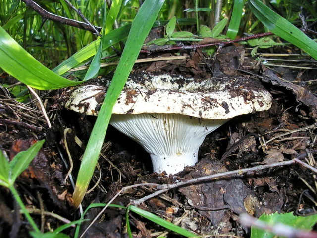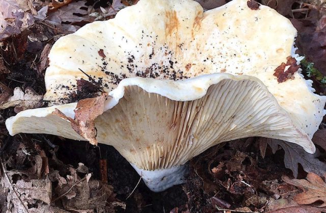 Esta especie crece en plantaciones de hoja caduca, pero a veces también se puede encontrar en coníferas. El diámetro del sombrero alcanza los 12 cm. Los hongos de leche pequeños parecen una pequeña campana, pero a medida que maduran, la forma cambia a forma de embudo. La superficie está seca y aterciopelada, puede haber grietas en el centro. El color principal es el blanco, pero hay manchas crema.