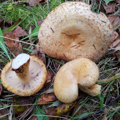 Esta especie crece en plantaciones mixtas y caducifolias. Forma micorrizas con abeto, sauce, abedul. El tamaño del tapón no supera los 14 cm de diámetro. Su forma, como la de la mayoría de los hongos con leche, tiene forma de embudo. La superficie es escamosa. Se vuelve pegajoso con mucha humedad. El tono principal es amarillo oscuro, pero se ven círculos concéntricos claros en él.